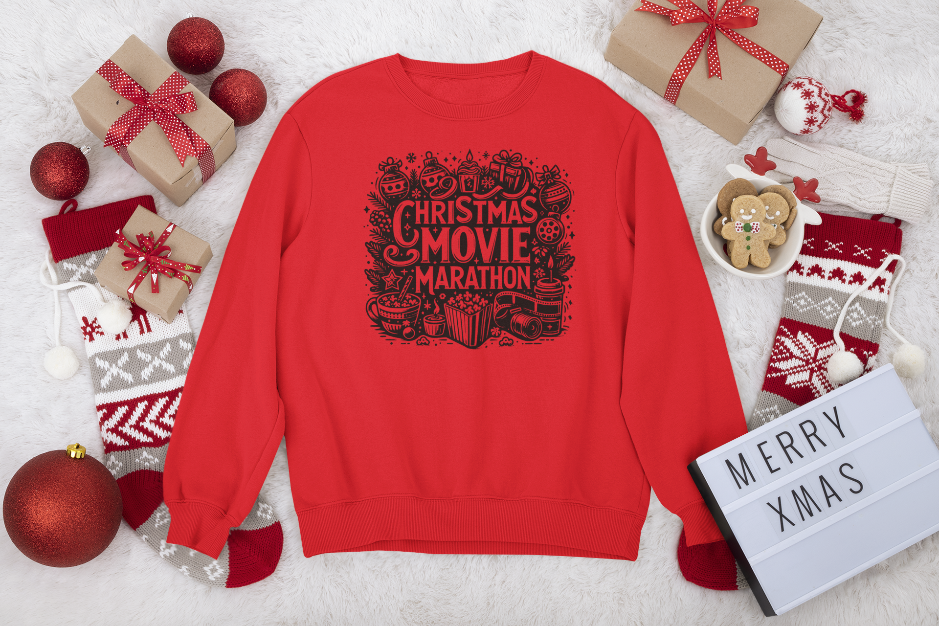 Get cozy for the ultimate holiday binge with our "Christmas Movie Marathon" sweater and T-shirt! Made for those who love nothing more than snuggling up and watching festive classics, this comfy sweater or tee is perfect for lounging on the couch during movie nights. Featuring fun, holiday-themed designs and soft fabrics, it's ideal for pairing with blankets, hot cocoa, and your favorite Christmas films. Whether you're treating yourself or gifting it to a fellow Christmas movie fan, this piece is a must have for spreading cozy, cinematic holiday vibes all season long.
